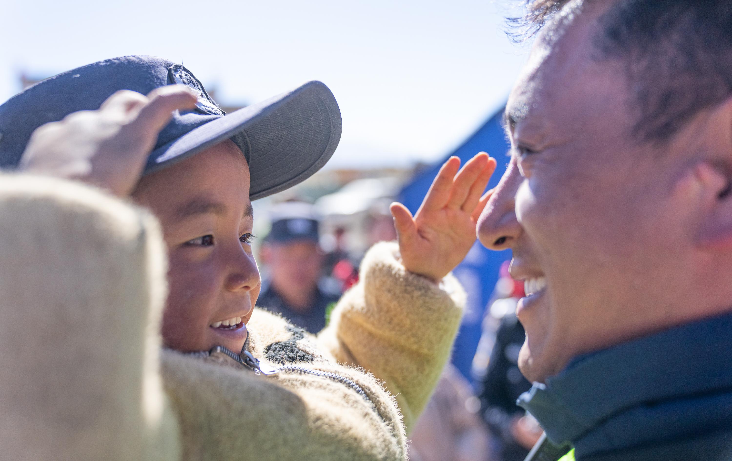 1月14日,在西藏定日县长所乡嘎布村,一名小朋友戴上移民警察米玛次仁的帽子敬礼。