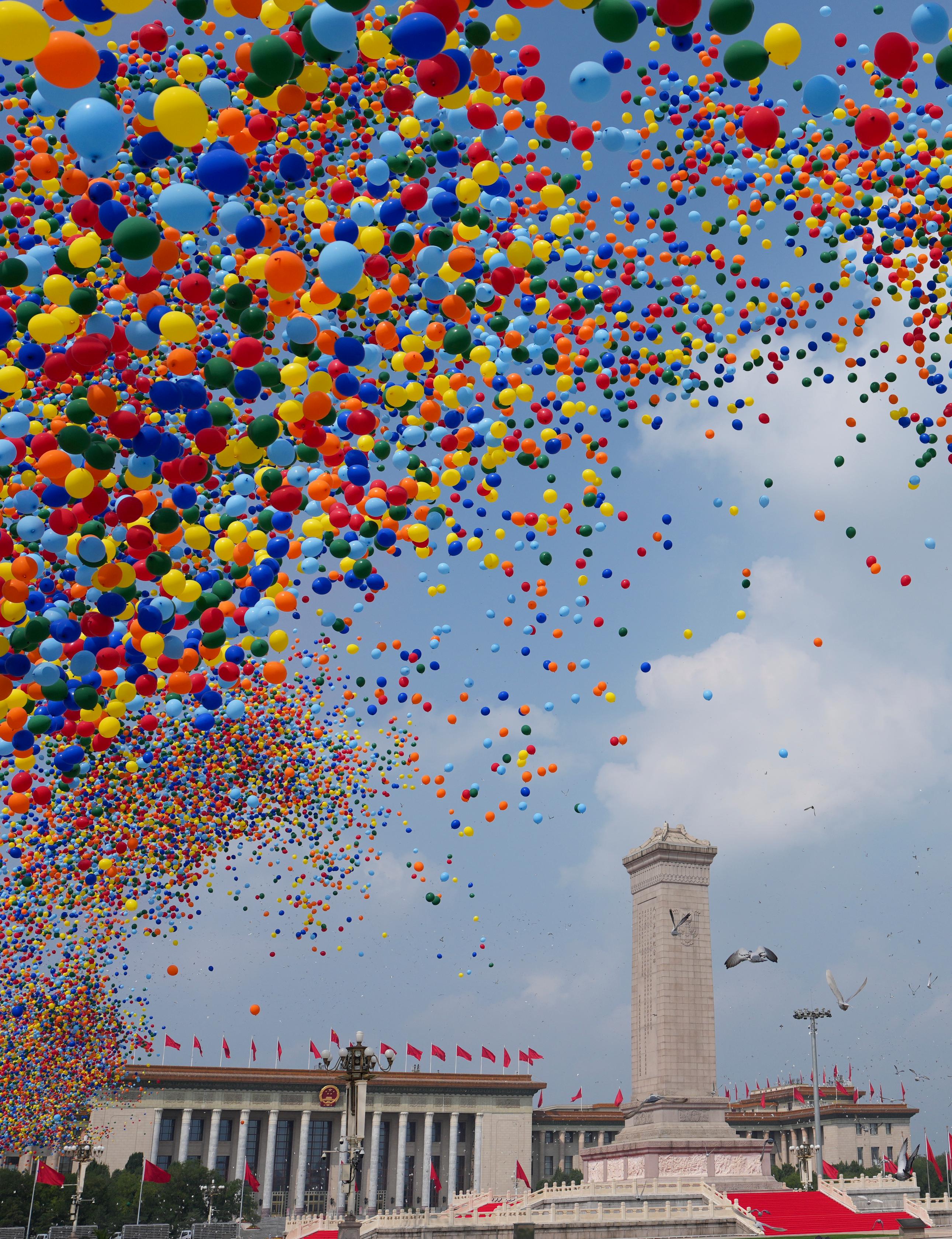 这是纪念大会现场放飞的气球和鸽子。
